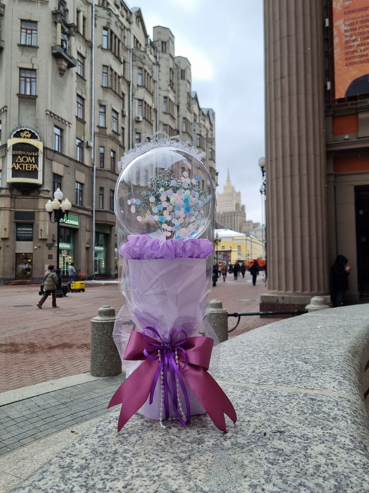 Прозрачный шар с мягкой игрушкой или с цветами выглядит как настоящий миниатюрный мир, создавая атмосферу волшебства и праздника.
